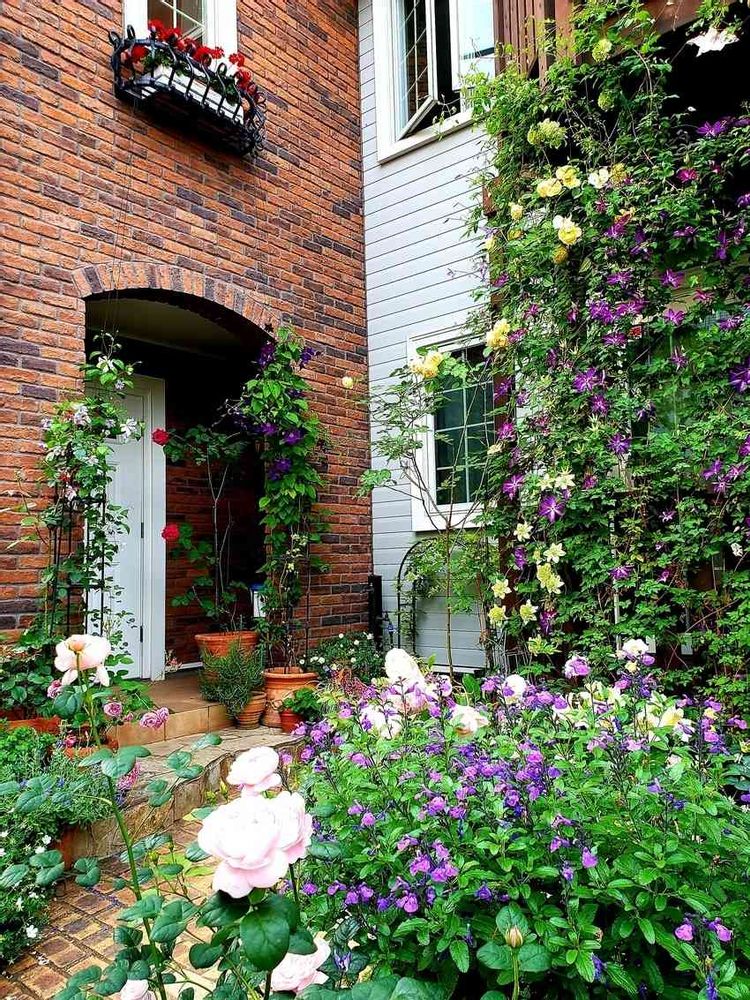 クレマチスとたくさんの薔薇と、煉瓦の外壁がとっても素敵なお宅です。