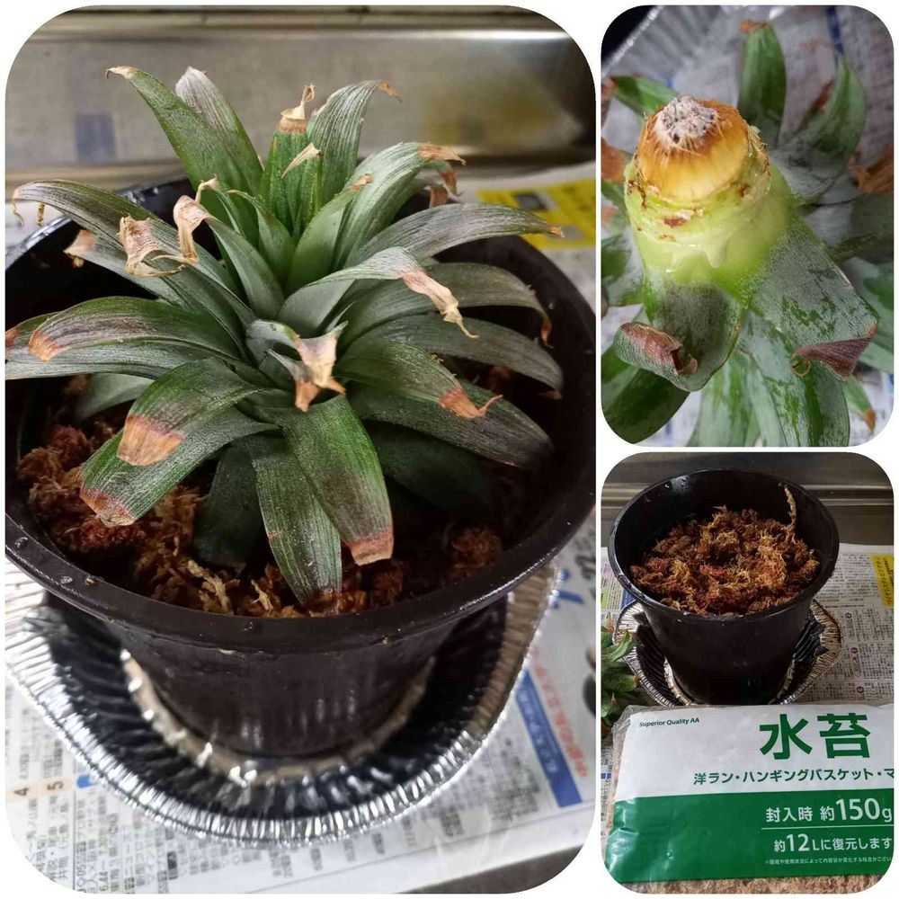 育て方を検索したら水苔に植えるって書いてあったので、乾かし過ぎたパイナップルを植えてみましたꉂꉂ(>ᗜ<*)
