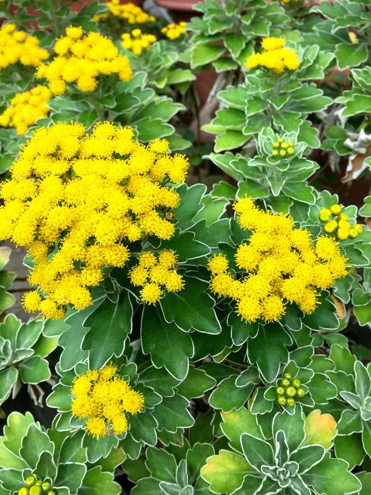 この可愛い花は、磯菊(いそぎく)です。磯に自生するので、この名前がつきました。丸く黄色い花がまとまって咲きます。葉っぱは波打つギザギザ形です。白く縁どりされているように見えますが、真っ白い葉裏が、表の緑の葉っぱまでまわってきてそう見えるようです。春に挿し芽で増やせますよ🤗