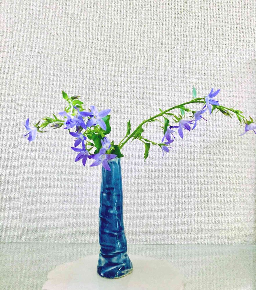 涼しげなカンパニュラアルペンブルーのお花ですネェ✨薄紫色が美しく、花瓶の瑠璃色と合っていてステキですネェ✨🎶
