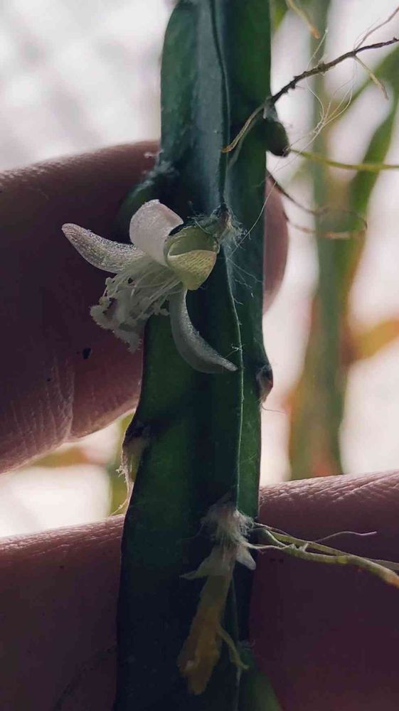なんかスターチスの茎みたいな葉っぱのリプサリスのような子に、花が咲いた😳