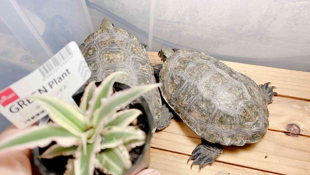 我が家の大(ダイ)君と小(ショウ)君です。ニホンイシガメの兄弟です。