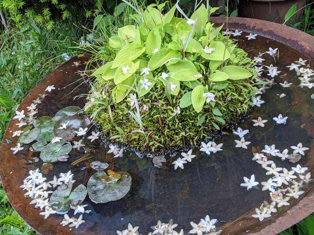 エゴの木の根元に置いてある鉄鉢にお花が沢山落ちます。…この鉄鉢は中の睡蓮がきれいに咲いたらご紹介しようと思っていたのですが、今日エゴの白いお花できれいに見えましたので…。風化して随分錆びましたが。