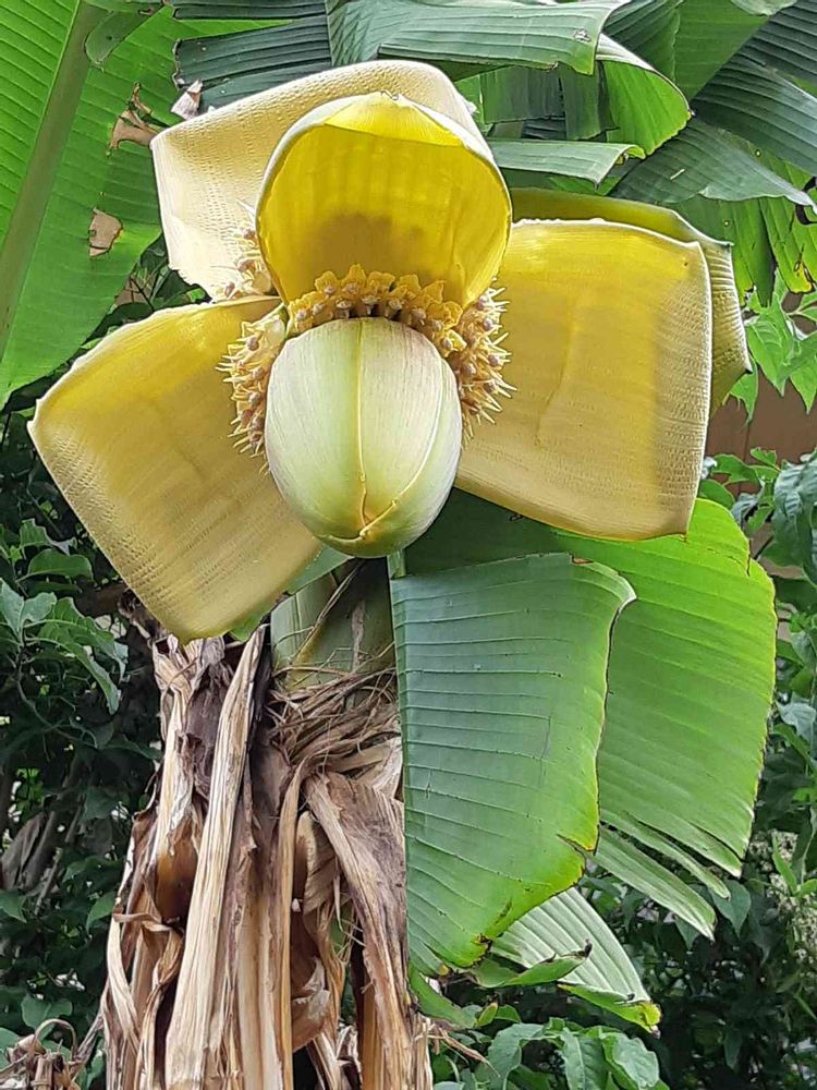 こんばんは😃🌃今日は蒸し暑い、1日でした。曇り⛅☁️🌂雨も、夕方パラパラ降りましたが、午前中、午後からも、畑仕事、花壇の、薔薇🌹の、処理等に忙しくしてました。花は、ガーデン仲間の、家の後ろ、道路沿いに、咲いてる、バナナ🍌の、花です。モンキーバナナ位の、実が、花の後緑色したバナナが、びっしりつきます。温室ではないので、食べる迄はいかないみたいです😌💓。毎年、咲きます。2階の、窓から、娘さんが、まだ小学校低学年の、頃屋根で、遊んでいるうちに、滑ってバナナの木に、助けられたそうで、切りたくても、切れないんですよ😉って言ってました。