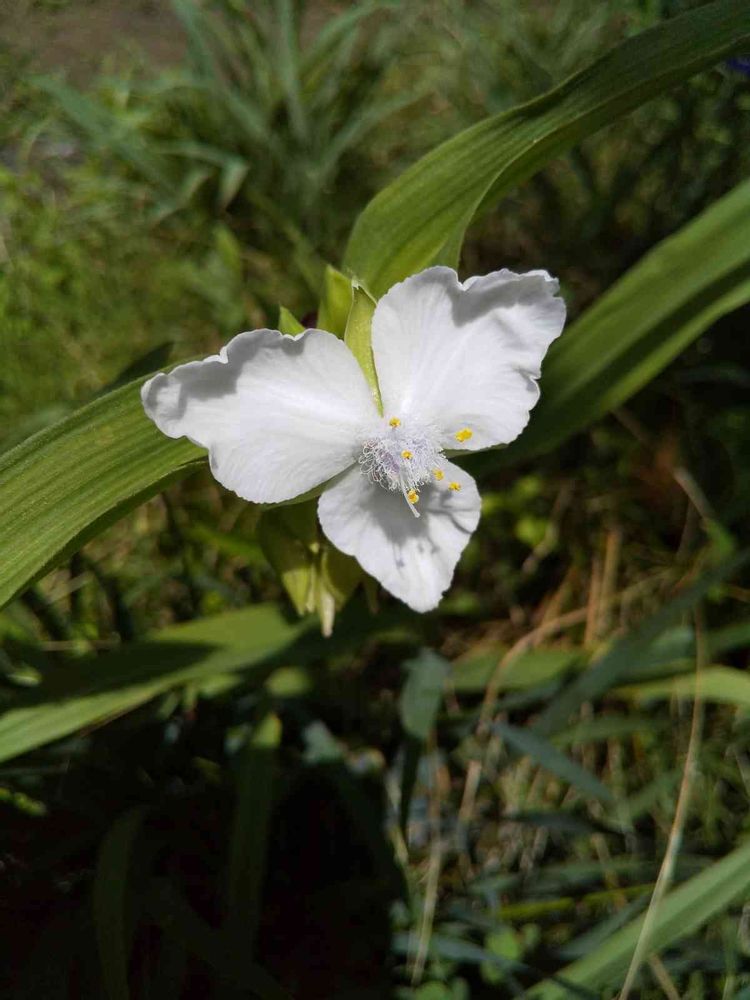 ムラサキツユクサ の側に白色が ありました🎶 白い花の「トキワツユクサ」とは 葉の形が違いますね!