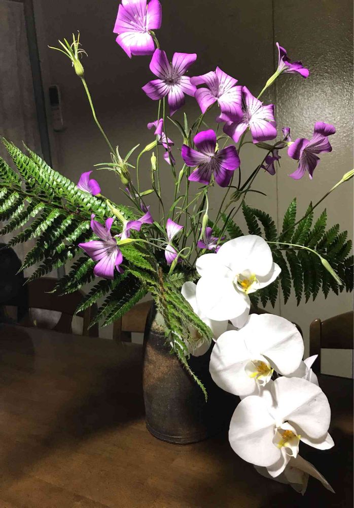 さん はあい。植え替えをしたいから貰ってくれなぁい?ということで7輪もついてるのに上手く撮れなくて。口が狭くてもっと高さのある花瓶じゃないとね。胡蝶蘭活けるの初めてだったから難しかったわ。急に雨本降り☂️なってきたので適当にしだとアグロステンマカットしてああでもないこうでもないと奮闘しました。お褒めいただき恐縮です。🙇♀️