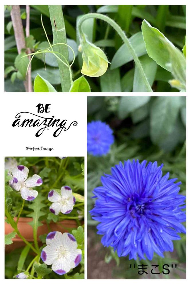 今日の風にヤグルマギクが揺らぎ、スィートピーが蕾を見せて、根元はネモフィラが咲いています💙💖💜💘