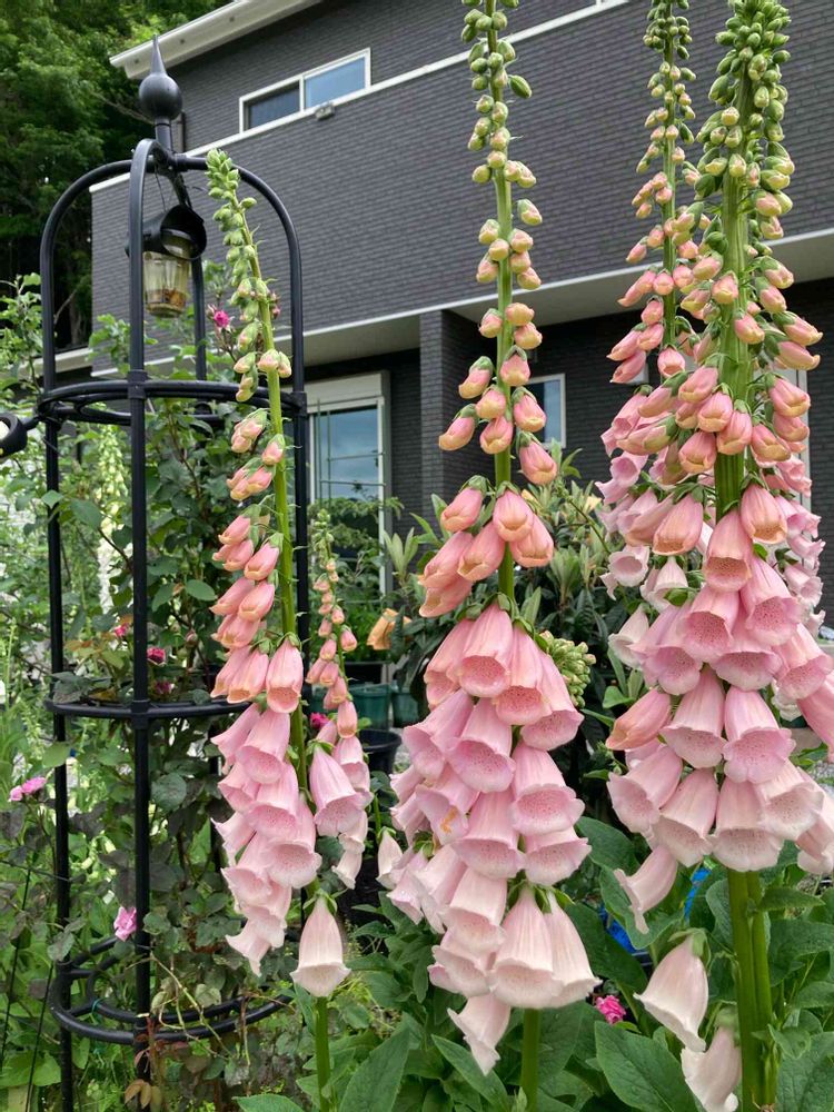 今年は昨年より大株になり、見栄えがするジギタリス(Foxglove)になりました。大好きな柔らかなアプリコットピンクのグラデーションが長く楽しめます。
