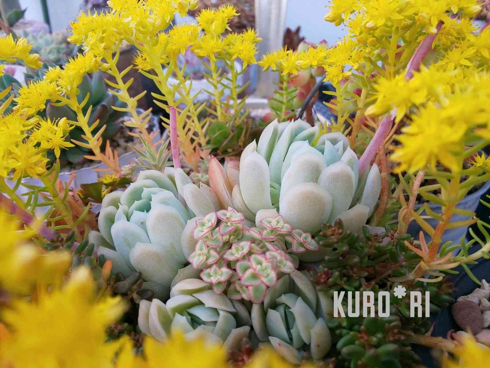 エレガンスの緑とセダムゴールドビューティーの黄色い色が合わせて見たら綺麗かなぁって寄せたら花が爆咲き🤣
