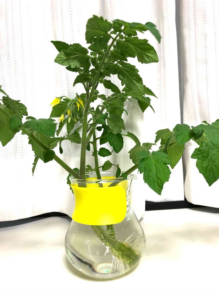 数日前に折れたミニトマトの枝から、もう根っこがボーボー、花も咲き始めて、これなら安心。近いうちに鉢に植え替えよう❗️