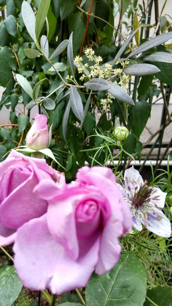 隣はニゲラ、後ろは満開のオリーブ🫒