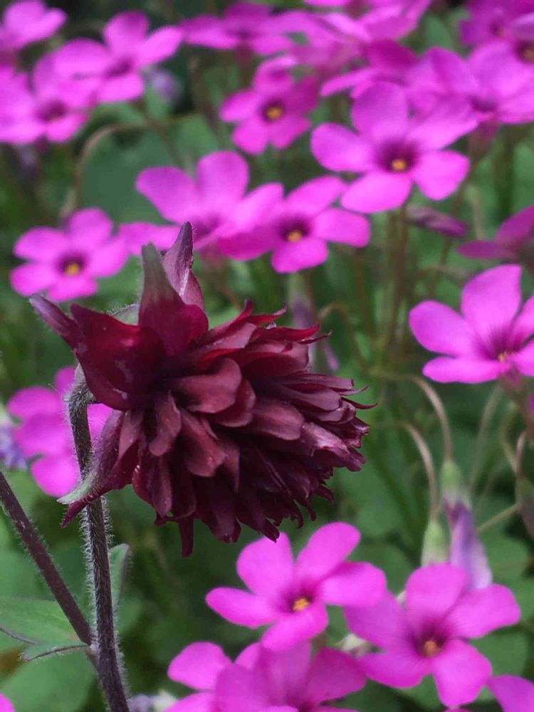 イモカタバミの中に入って、窮屈なのか西洋オダマキが、小さく咲いています。
