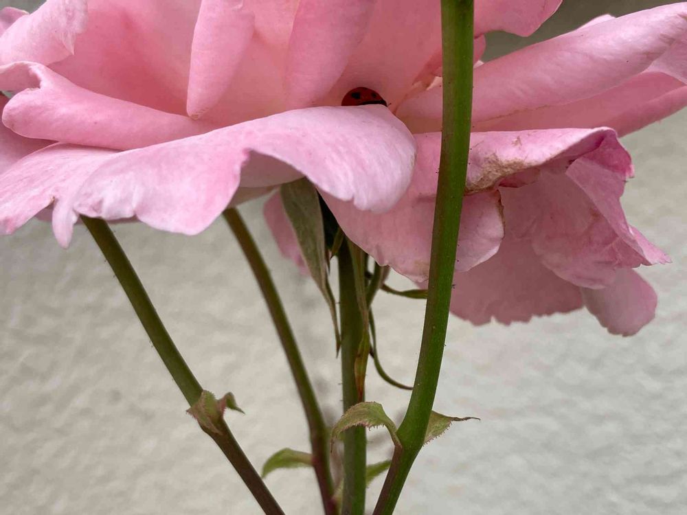 てんとう虫。雨宿りしてたのかな?昨日はどちらかと言えば雨より風がひどかったけど。写してないけど、すぐ隣の蕾のアブラムシをどうにかして〜!
