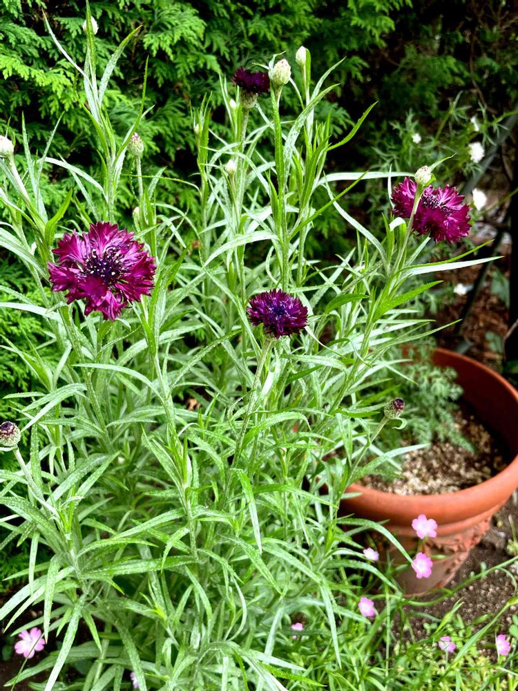 ジメジメしたお天気が続きますが、セントーレアが咲きました。だんだんこのシックな色が素敵に見えて好きになってきた😳