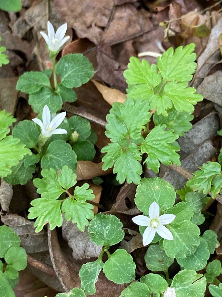 タニギキョウです。ニワゼキショウの半分もないような大きさで、ラッパ🎺の形をしてます。背丈も数センチと低いため、薄暗い森の中で白い点々のように見えます。