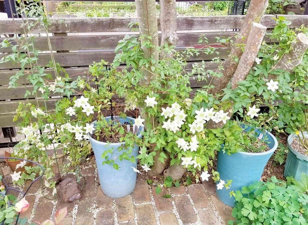 今年は誘引が面倒になり木や仮置きしていた支柱にテグスを巻き、適当に巻き付けてしまった😣😫 花が奥の方にあったり、固まって咲いていてバランスよろしくない。やはりちゃんとやらないとダメだね😓
