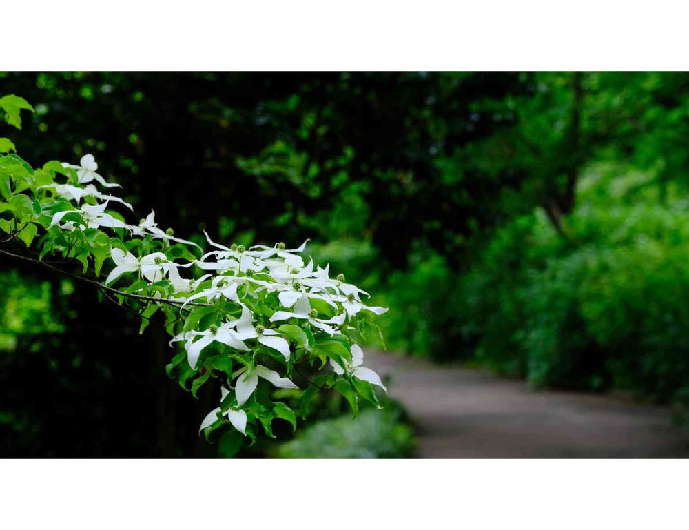 紫陽花の時期にはまだ少し早いしっとりとした緑の中にヤマボウシの白がほんのり浮かび上がります。