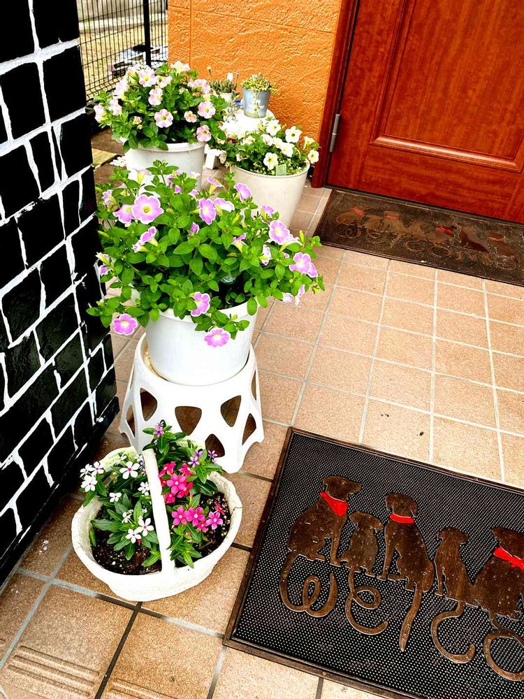 梅雨入り中なので玄関ポーチや軒下スペースで待機中のサフィニアチーム💖