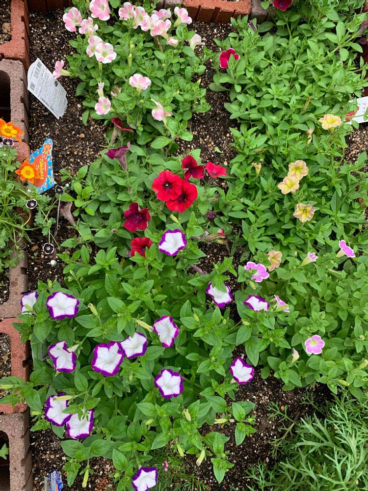 妹と一緒に作った花壇に植えたサフィニア達と端っこにマックスマム✨