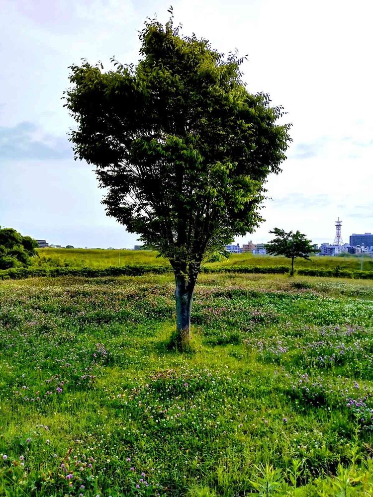 不動池の近くの原っぱに、たった1本の🌳とシロツメクサとアカツメクサが、一面に咲いていました。