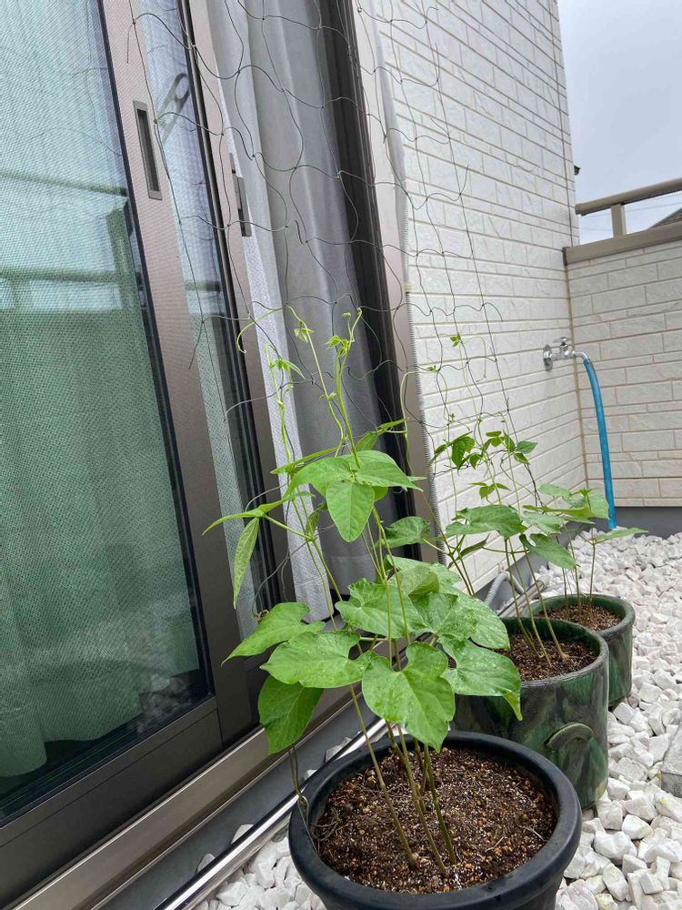 雨が降り出す前に大急ぎでインゲンのグリーンカーテンを設置しました。鉢が小さいかなーとも思いましたが。