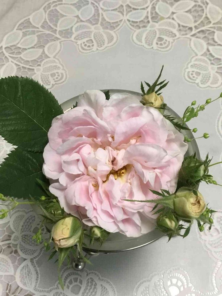 優しいピンクのロゼット咲きのお花 灰緑色の葉 よい香りの大好きなバラです