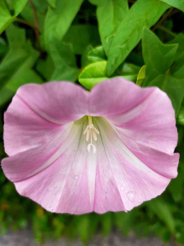 小雨降る夕方の帰り道、植え込みにヒルガオが紛れて咲いていました☺