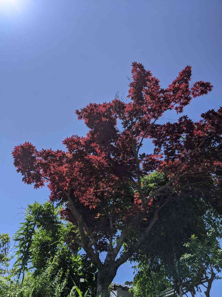 モミジですが、今の赤色、も、綺麗ですょ!梅雨の晴間。✌️🤭🙀