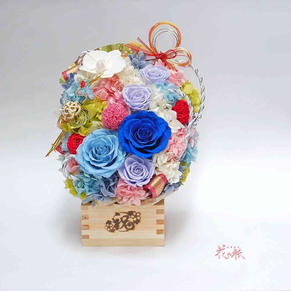 青色の薔薇と白い胡蝶蘭のプリザーブドフラワーが爽やかな枡のお花🌸