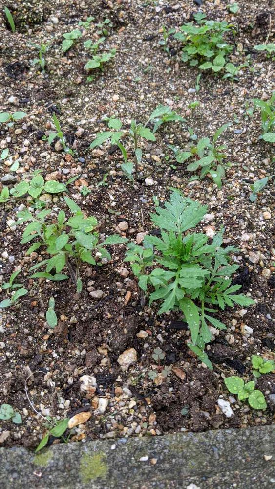 マリーゴールドだと思って育ててたら一部去年植えていたミニトマトのこぼれ種から芽が出たミニトマトの芽でした。マリーゴールドよりもミニトマトの方が沢山芽が出てます。