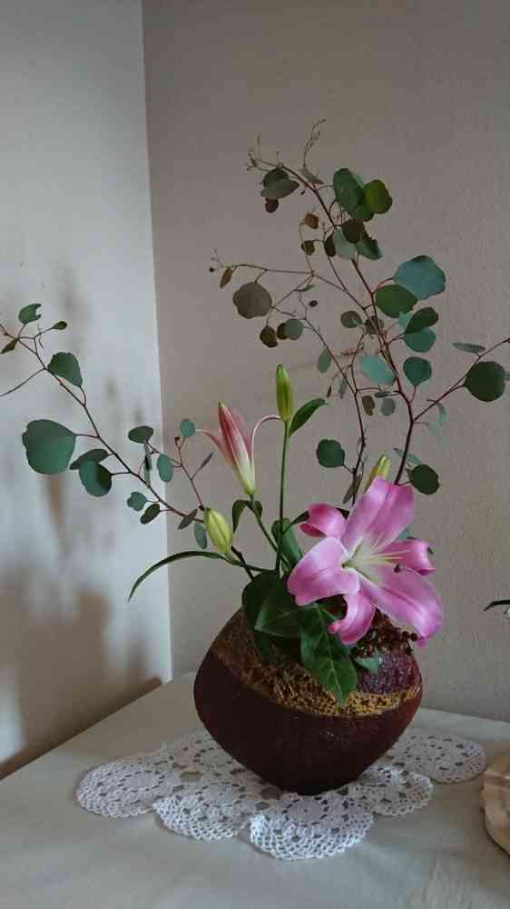 部屋のコーナーには ピンクの百合と ユーカリ ポポラスと下の方には万両の実を入れて!