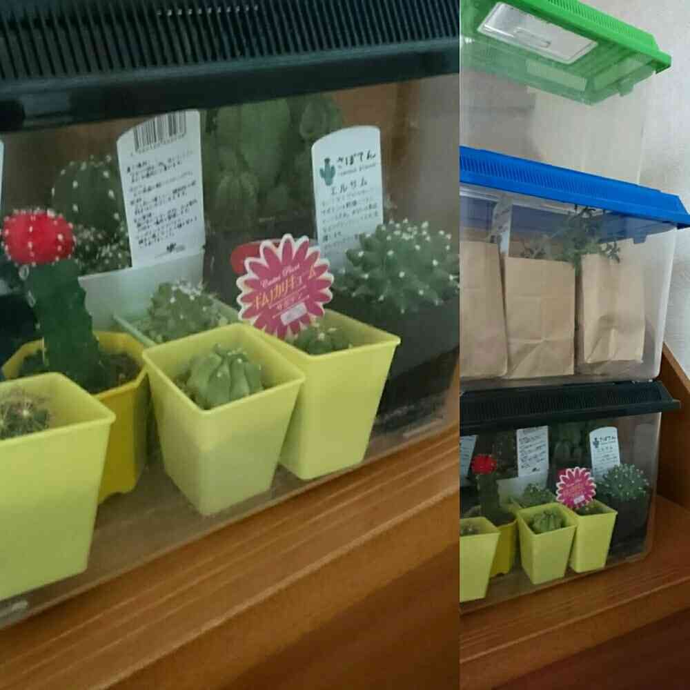 外の簡易温室だと元気なくりそうなサボテン達を子供の虫かごで一時的に部屋の中へ