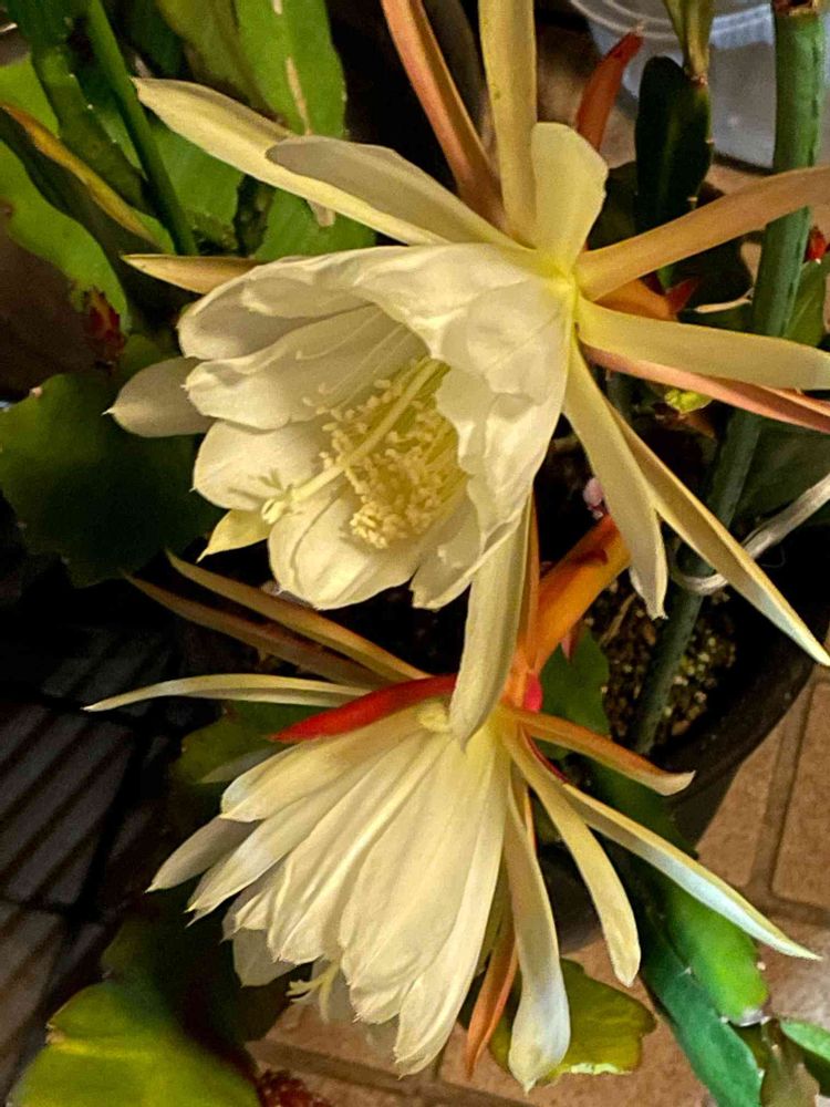 曇ってるので、朝もまだ少し開いてました。月下美人ほどではないけれど、このお花も基本開くのは夜中です🌔