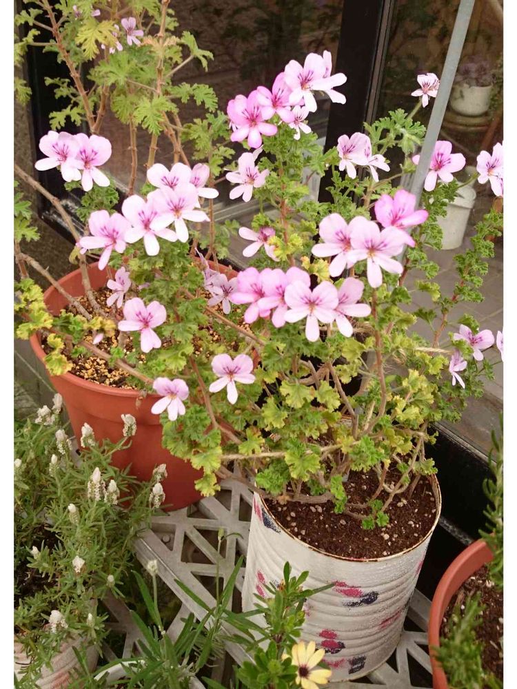 奥のローズゼラニウムも今までで一番たくさん花が咲きましたが、下葉がどんどん落ちて…また鉢上げですか…😅