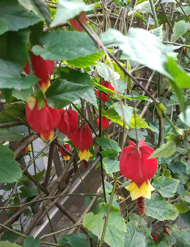 アブチロンとかチロリアンランプとかの呼び方もあります😁私はアブチロンって呼んでます😅薔薇とか色々な葉っぱの陰で咲いているのですが赤いので発見できます、結構目立ちますね、まさにランプです😁