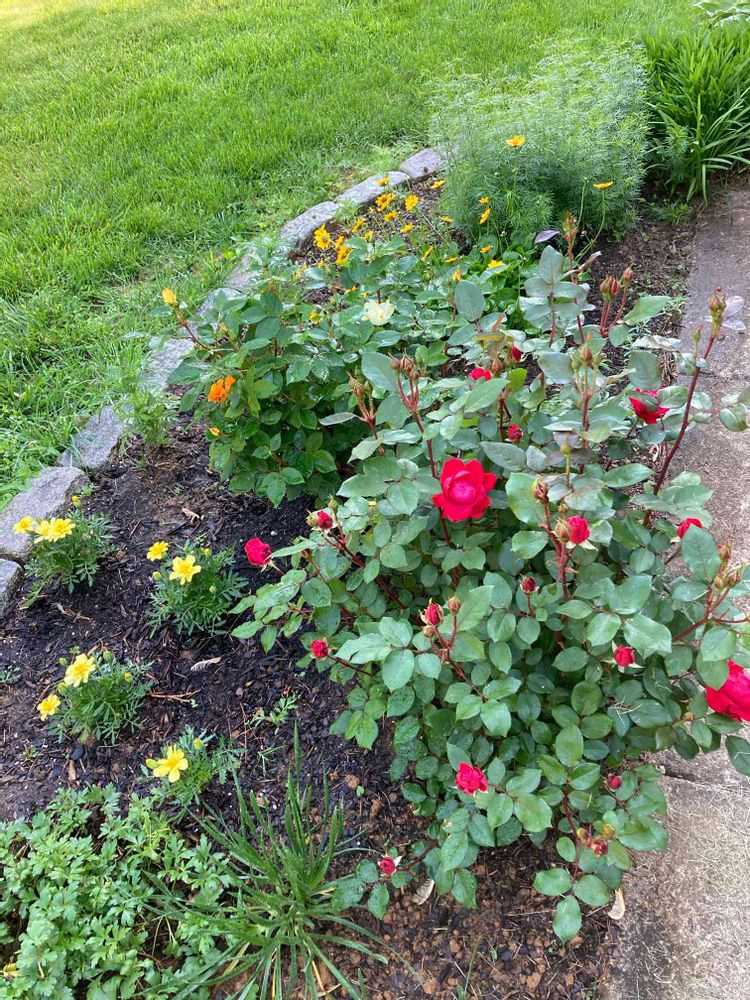 私の初薔薇のノックアウトです。去年は蕾が沢山出来てもうすぐ咲く!と思った時に鹿にぜーんぶ食べられてしまい、大ショックでした。今年はしっかり鹿避けスプレーしました😊病気や虫にやられながらもこれだけ咲いてくれて大満足です👍