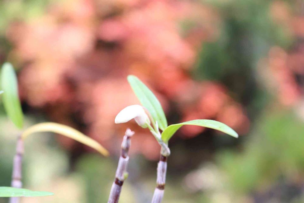 セッコク(o^^o) 最後のツボミ!もう直ぐ咲くなぁ〜〜。鳥みたいだから紅葉バック🍁に飛ばしてみました〜