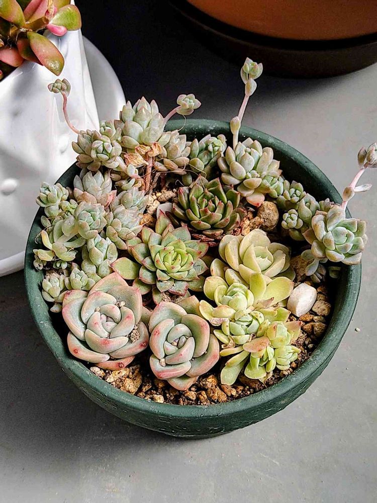 こないだ、夜勤前に到着したシュークリームちゃんとプロリフェラちゃんを元からいる小さなエケベリアちゃんたちと寄せてみました😆❣️