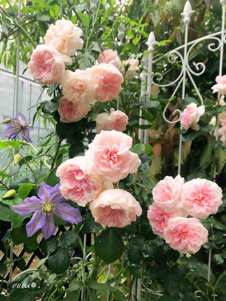 クレマチス・プリンスチャールズも咲き始めました。コラボ叶った…✨それにしても雨続きでお花がボテっとしてしまう。