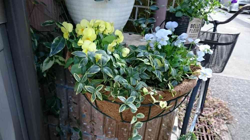 ヒメツルニチニチソウだけになってたハンギングにパステル系ビオラを追加しました…。