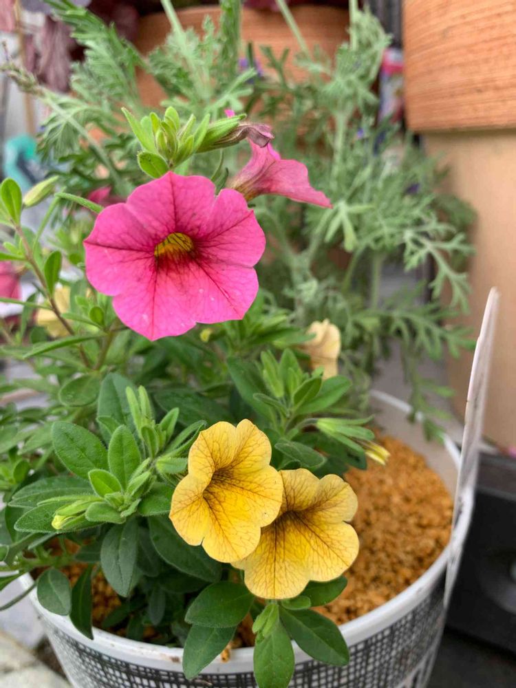 この2色鉢が目にはいり、パープル、ピンク、イエローの3色鉢に😆