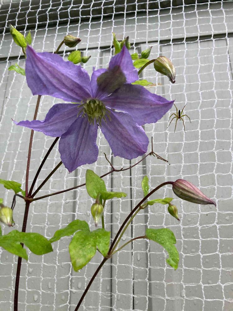 昨年定植の2年生クレマチス。悪天候にも関わらず、次々と爽やかな花を咲かせています。