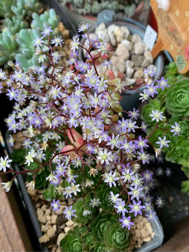チャティさんから頂いたセダムで唯一の青い花が咲く、カウルレア😊
