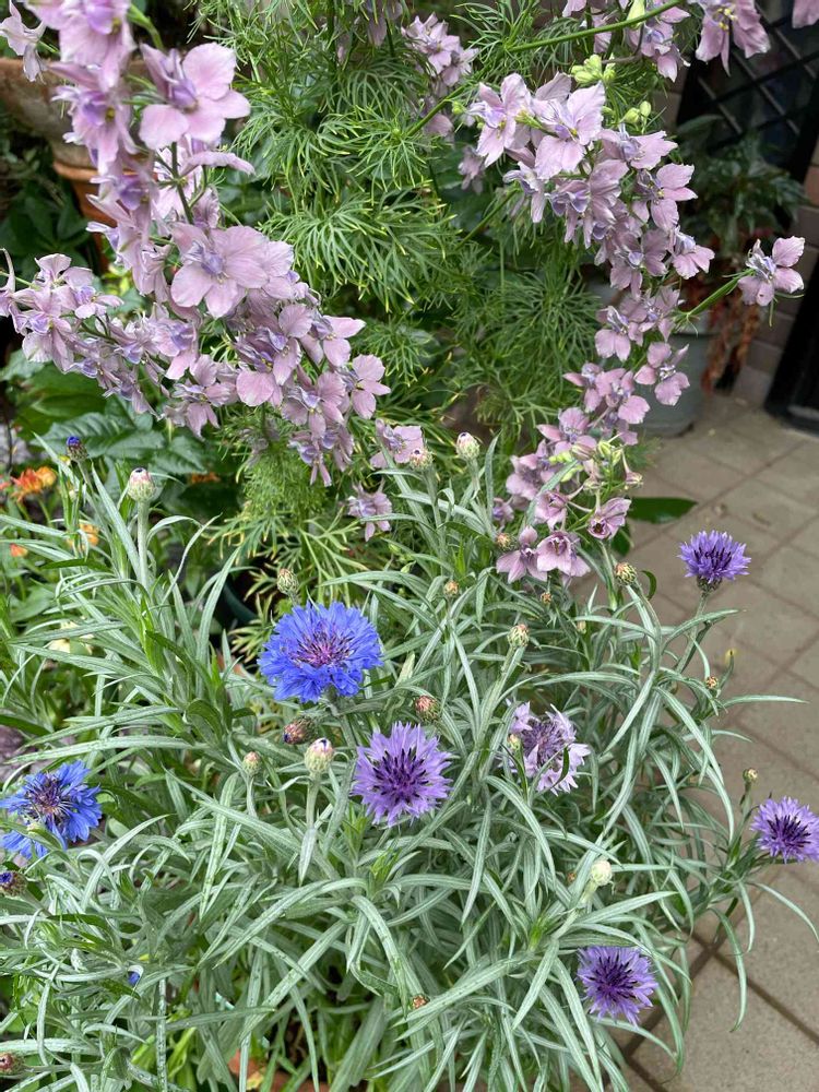 このセントーレア2色は、春先に苗で購入しましたが、シルバーの葉が🌿千鳥草に合うかな〜と一緒に植えてみました。花が咲いてきたら千鳥草にピッタリだったので満足しています😃