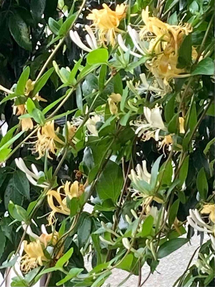 ご近所さんのところのスイカズラいつのまにか いっぱい咲いていました。