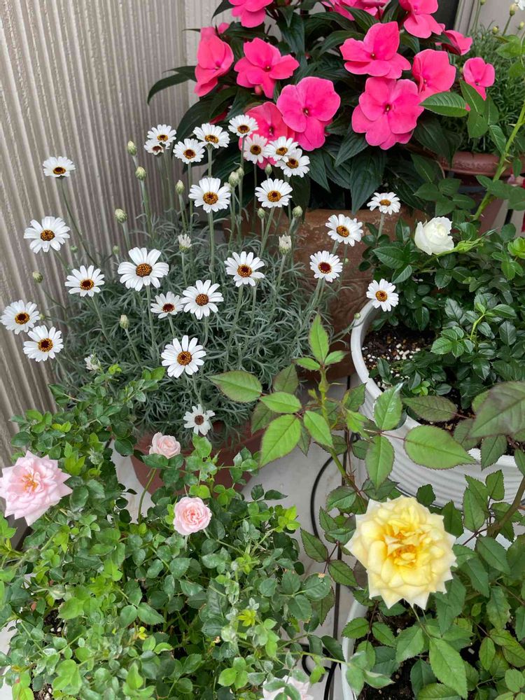 先程投稿したシクラメンの他に玄関ポーチで雨宿りしているニューギニアインパチェンス、ローダンセマムエルフピンク、ミニ薔薇3種類🌹