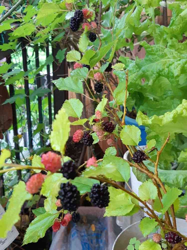 去年挿し木した桑の木にも沢山実が付いたが雨で沢山落ちたから慌てて雨当たらない方に移動!ベランダで!