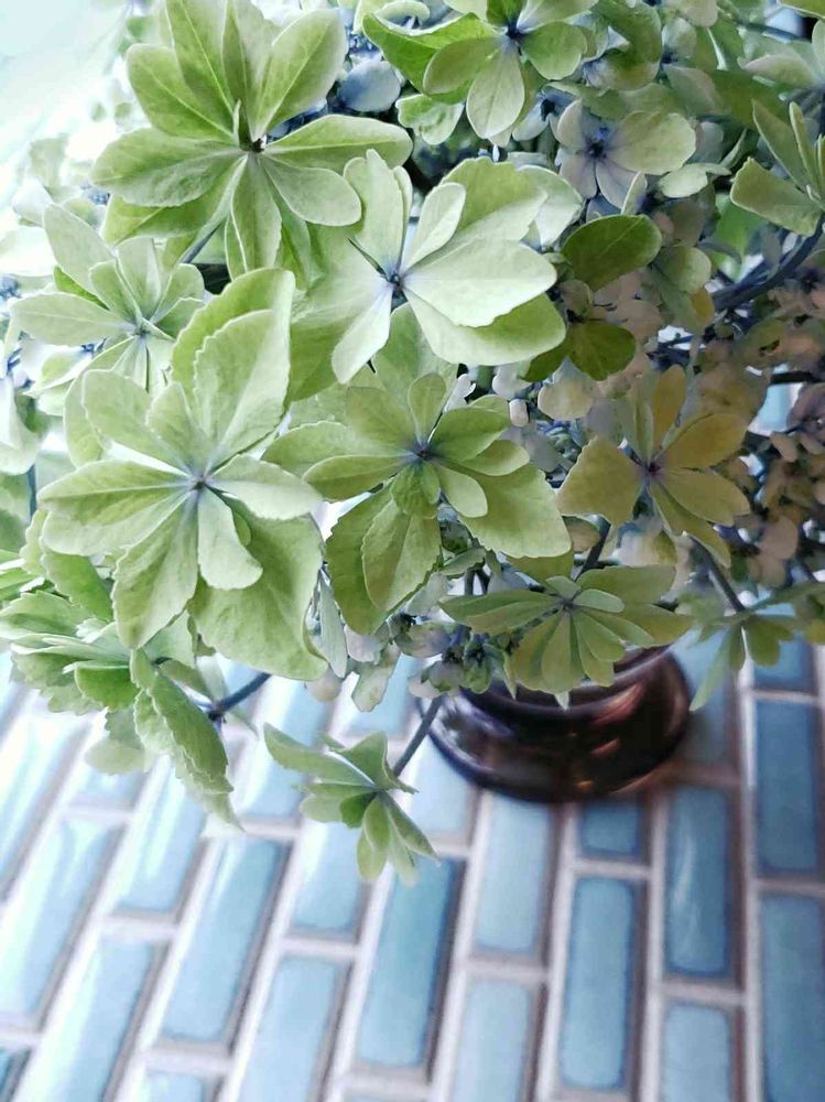 ライムグリーンになりつつある紫陽花の空海。4月からずっと咲いているのでいくつかカットしてキッチンに飾りました🍃