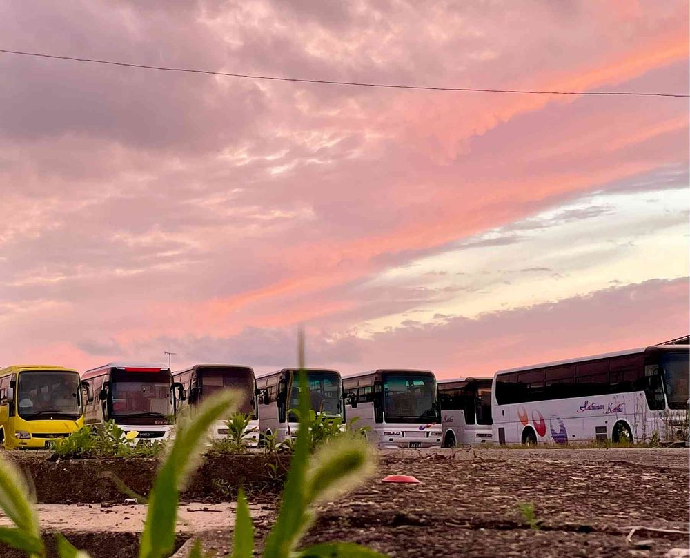 コロナで悲しんでいるバスの姿、まもなく終わるよと、空に明かりが出ている、勝手な想像🤔手前の花は何んだろう⁉️