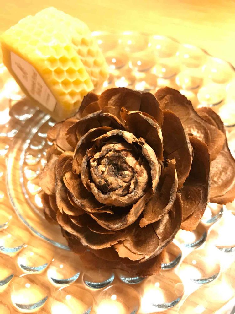 左上にあるのは蜜蝋です。天然蜜蝋100%らしいのですが、もらってきたもので、どう使ったら良いか分からず、飾っています😅